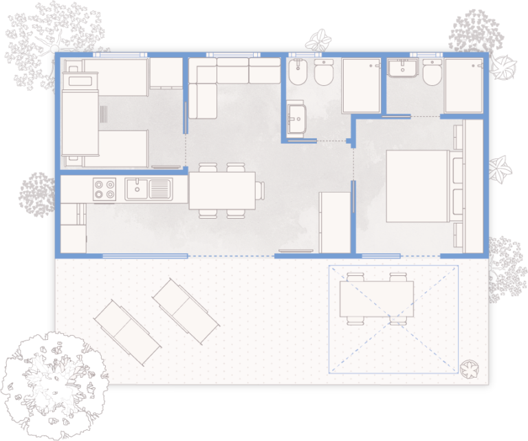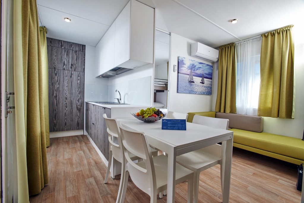 Zwei Schlafzimmer und zwei Badezimmer mit Duschkabine bieten bequem Platz für bis zu 5 Personen. Der geräumige Wohnbereich mit ausgestatteter Küche ist durch die großen Panoramafenster mit dem Außenbereich verbunden. Die Verkleidung aus ökologischem Faserzement und Holzlatten garantiert für Wärmedämmung und harmoniert mit der Umgebung. Die teilweise überdachte Terrasse erweitert den Wohnraum und ist perfekt, um sich im Freien zu entspannen. Im Aufenthalt inbegriffen: reservierter Strandplatz, Welcome Service mit gemachten Betten und ein Handtuch-Set für jeden Urlaubsgast.