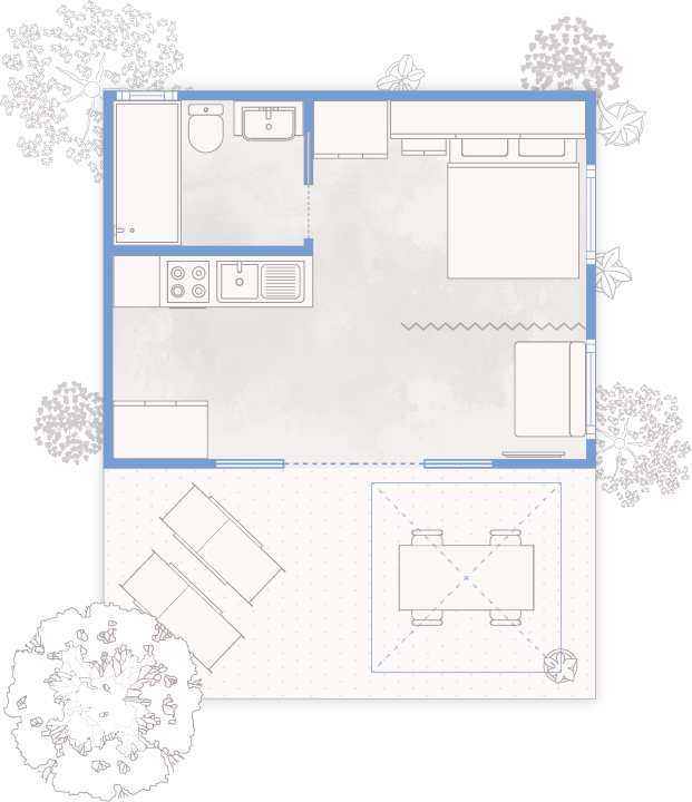 The open-plan sleeping area features a double bed, a fully equipped kitchenette, and a bathroom with shower. Large windows flood the space with natural light and create a seamless connection between indoors and out. Natural materials and eco-friendly furnishings ensure comfort and good insulation. The outdoor terrace extends the living space – a lovely spot for relaxing among the greenery. Included in your stay: a reserved beach spot and a Welcome Service with made-up beds and a towel set for each guest.