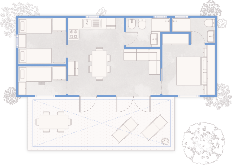 The Chalet Riviera is the ideal choice for those looking for space, comfort, and nature in Cavallino Treporti, just a few steps from the sea and close to Venice. Nestled in the pine forest of Camping Village Mediterraneo, it offers spacious, functional accommodation for large families or groups of friends. A 5-star holiday combining relaxation, privacy, and exclusive services.