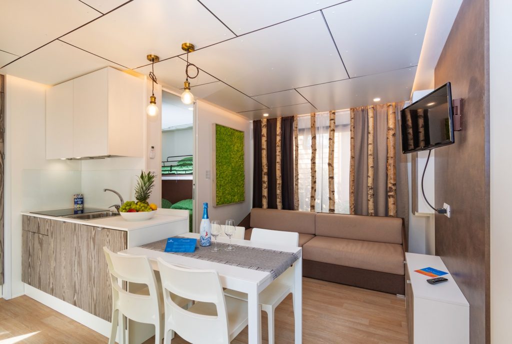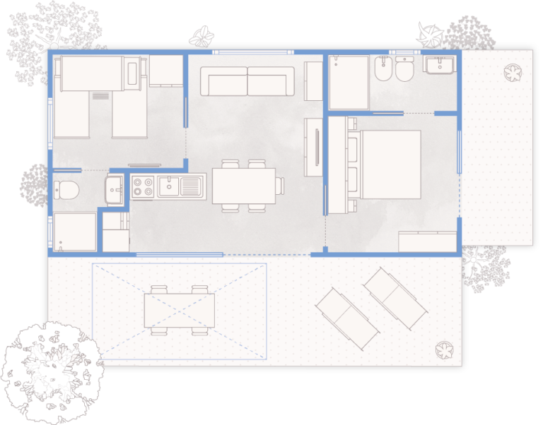 Due camere da letto e due bagni con box doccia garantiscono spazio e privacy fino a 5 persone. L’ampio soggiorno con cucina attrezzata è pensato per vivere la vacanza con la libertà di casa. Le grandi vetrate e il rivestimento in sughero naturale assicurano luminosità, isolamento termico e acustico. Due ampie terrazze in legno diventano lo spazio perfetto per pranzi all’aperto e momenti di relax immersi nella pineta. Inclusi nel soggiorno: postazione spiaggia riservata e Welcome Service con letti preparati e set asciugamani per ogni ospite.