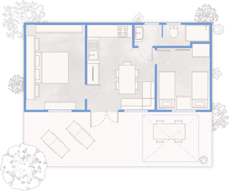 Il Maxi Med Classic può ospitare fino a 5 persone grazie alla camera matrimoniale e alla seconda camera con letti singoli. Il soggiorno con cucina attrezzata garantisce autonomia e praticità durante tutta la vacanza. Le ampie terrazze esterne immerse nel verde sono ideali per rilassarsi all’aria aperta. Aria condizionata e due TV digitali terrestri con canali esteri assicurano comfort e intrattenimento. Inclusa nel soggiorno: postazione spiaggia riservata per vivere il mare in totale comodità.